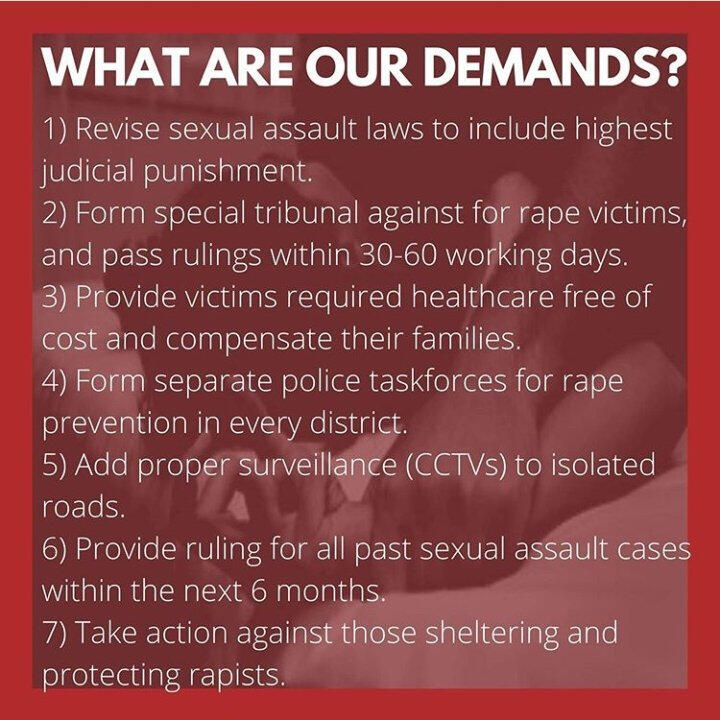 we're protesting in an attempt to have our voices heard, to have our demands fulfilled. we are hoping to fix the legal system. to do this we need to raise awareness, and we hope raising worldwide attention will finally cause our government to look out and realize what we want. please help us by spreading information related to this issue, and by helping us trend hashtags worldwide. the current ones being used are : #StopRapeCultureBangladesh, #WeWantRapeFreeBD, #HangRapistsPublicly